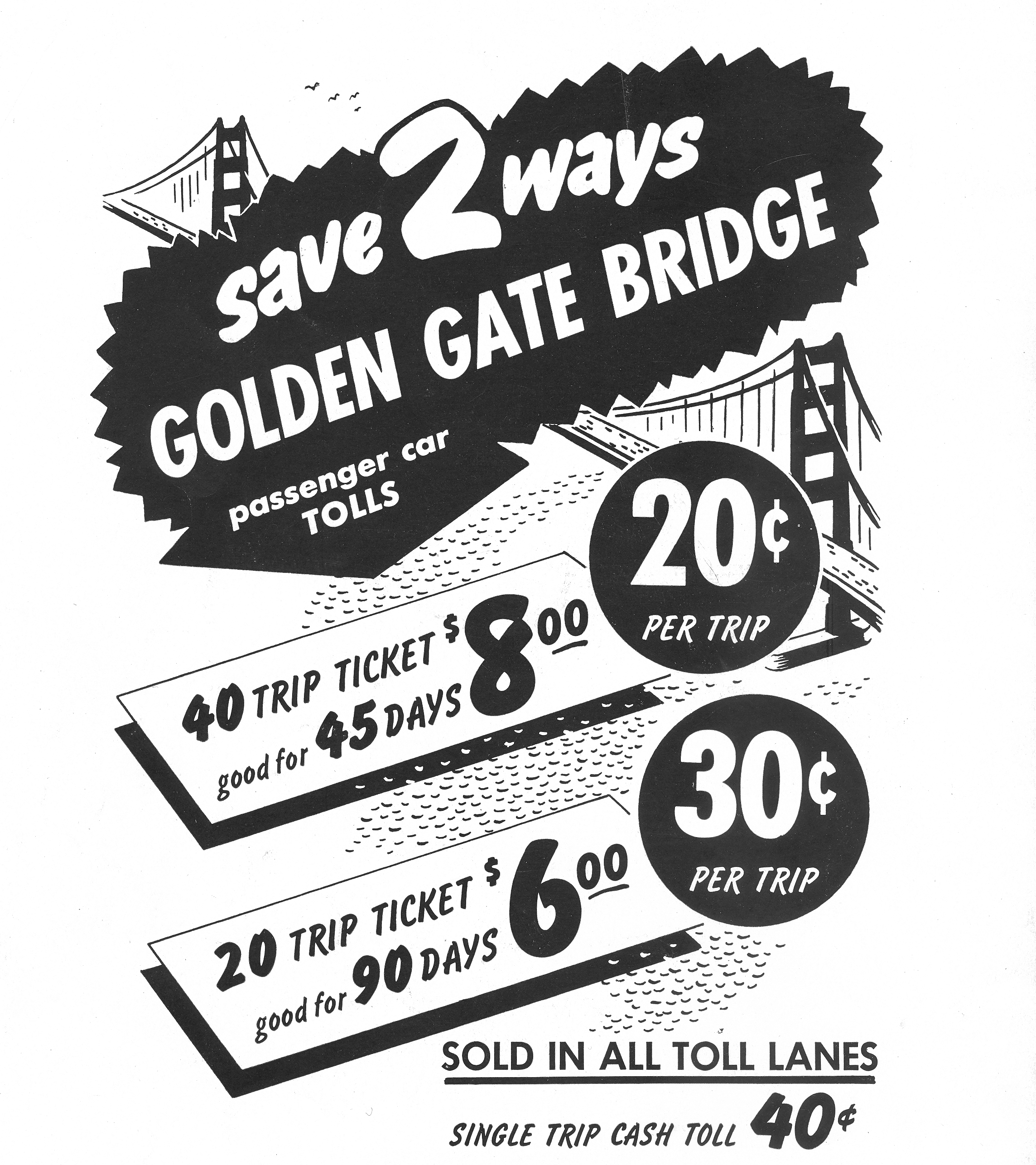 25-trip discount toll ticket book available for $10 (40 cents/trip)