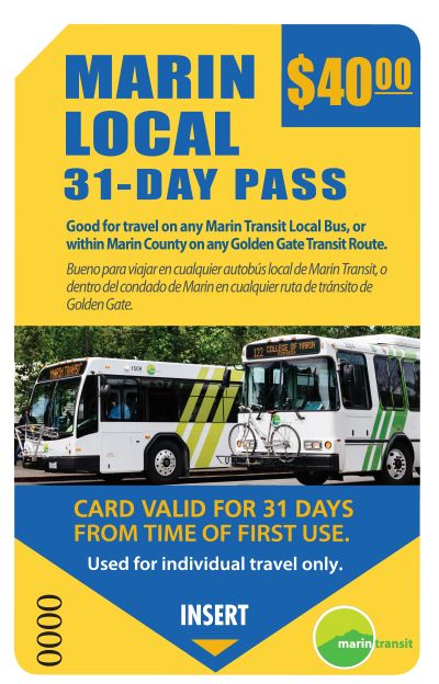 Marin Transit passes provide unlimited trips within Marin County in a given time period, so you no longer need to get a transfer from your bus driver. Simply swipe your pass every time you board the bus. Marin Transit passes may not be used outside Marin County.