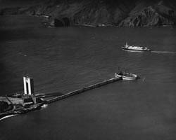 To reach the site of the south tower foundation, workers constructed a temporary roadway on a timber access trestle, or wharf, from the San Francisco shore. The dangers of the exposed location soon became apparent in 1933, when a freighter collided with the trestle. Two months later, over half of the repaired structure collapsed in a storm. Undaunted, the engineers and workers restored the structure and continued their work.