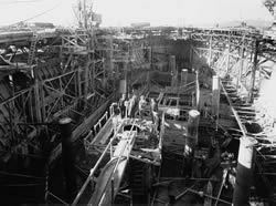 The foundation's reinforced concrete being built up from the bedrock of the seafloor. The vertical tubes are the inspection wells that allowed access down through the concrete.
