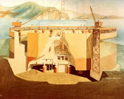 A cross section of the south tower fender walls and foundation. The illustration was done by Chesley Bonestell, a designer who worked on architectural details of the Chrysler Building in New York and other prominent buildings, and who later became one of the most famous illustrators of space exploration.