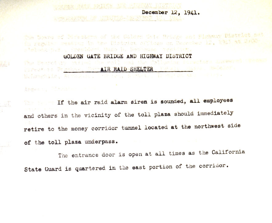 Memo about air raid shelter at the Golden Gate Bridge from the Golden Gate Bridge, Highway and Transportation District - Dated December 12, 1941 (five days after the attack on Pearl Harbor), this memo instructs Bridge employees where they should go to be protected in the air raid shelter if the air raid alarm is sounded. |