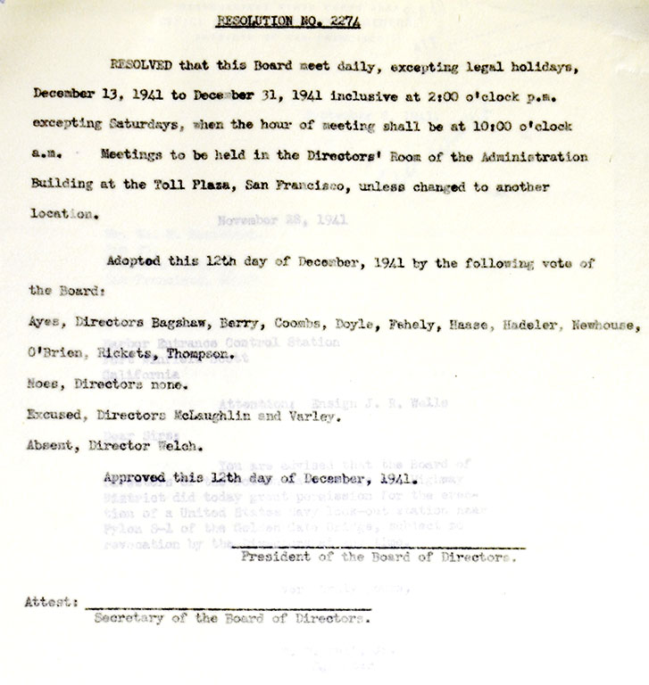 Resolution of the Board of Directors of the Golden Gate Bridge and Highway District to meet daily, following the December 7, 1941 attack on Pearl Harbor from the Golden Gate Bridge, Highway and Transportation District - The Board met December 12, five days after Pearl Harbor was attacked, and decided to meet daily during the rest of the month, excepting Saturdays. |