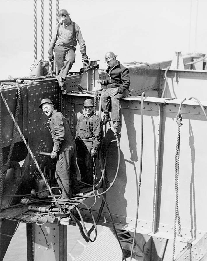 Safety was a priority. Workers wore helmets, special wind goggles, and headlamps for the dark, enclosed areas - a first in bridge construction. The undercoat of paint, the primer, contained lead to prevent the steel from rusting. Workers wore respirators to protect them from lead fumes released during the installation of red-hot rivets. Today, the paints used on the Bridge contain no lead.