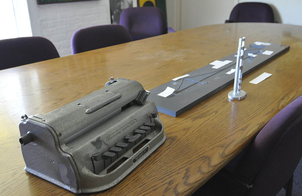 Prototypes of tactile models shown on right. Machine in foreground is used for creating braille text.
