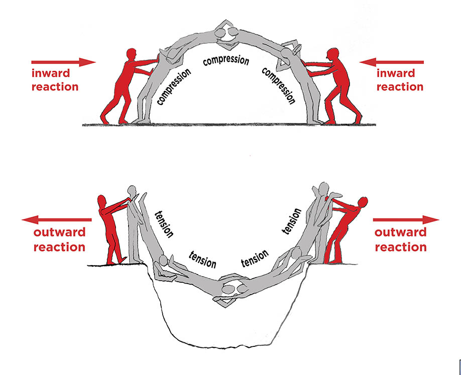 The curving cables of a suspension bridge are in tension, experiencing pulling forces. The opposite or upside down picture of those curves looks like an arch. The forces in the arch, compression forces, are the opposite of the tension forces that the suspension bridge cables experience.