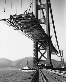 The final piece of the overall structure, the roadway deck structure with its paving, was in place by April 19, 1937, about a month before the Bridge opened.