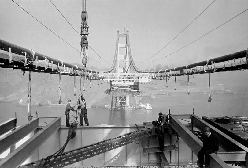 The final piece of the overall structure, the roadway deck structure with its paving, was in place by April 19, 1937, about a month before the Bridge opened.