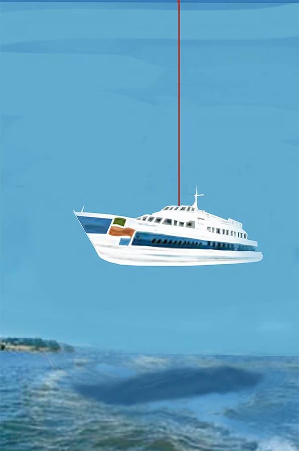 Facilities Engineer Jorge Lee at an exhibit on Golden Gate Ferry's M.S. San Francisco comparing the strength of each of the 500 vertical lines (steel suspender ropes) one sees across the Bridge with the weight of that half-million-pound ship.