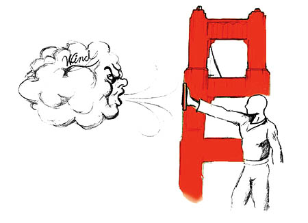 When wind pressure pushes on the Golden Gate Bridge, the Bridge must push back with enough force to stand up and remain stable.